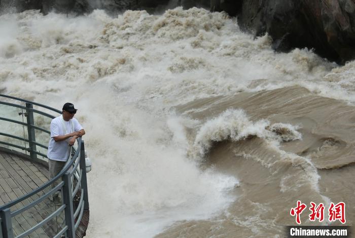 虎跳峽景區(qū)位于云南省迪慶藏族自治州香格里拉市,因猛虎躍江心石過江的傳說而得名。近日該地連續(xù)降雨,金沙江水位上漲,澎湃江水吸引游客。