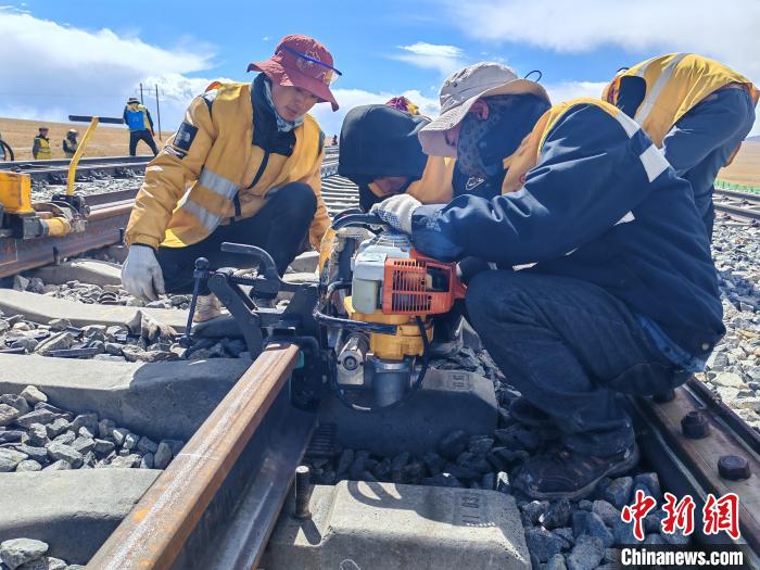 由中國鐵路青藏集團有限公司(以下簡稱青藏集團公司)格爾木工務段重點維修車間負責的開心嶺站站場緩沖區(qū)換軌改造施工正在稀薄的氧氣中進行。