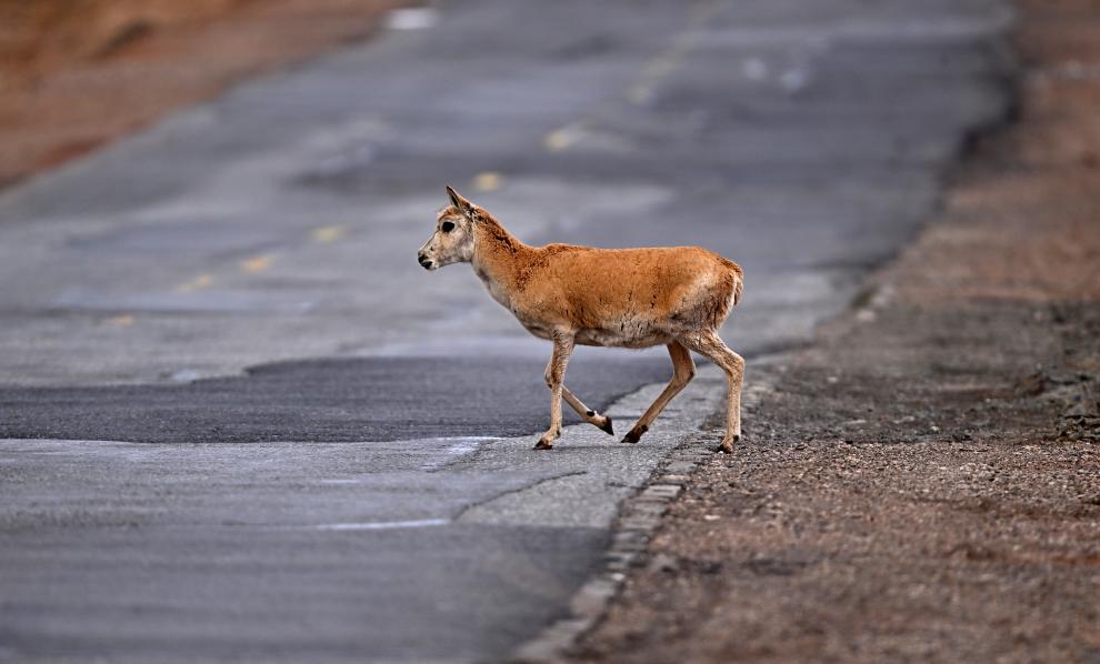 在可可西里,一只雌性待產(chǎn)藏羚羊通過(guò)青藏公路(2023年5月28日攝)。新華社記者 張宏祥 攝