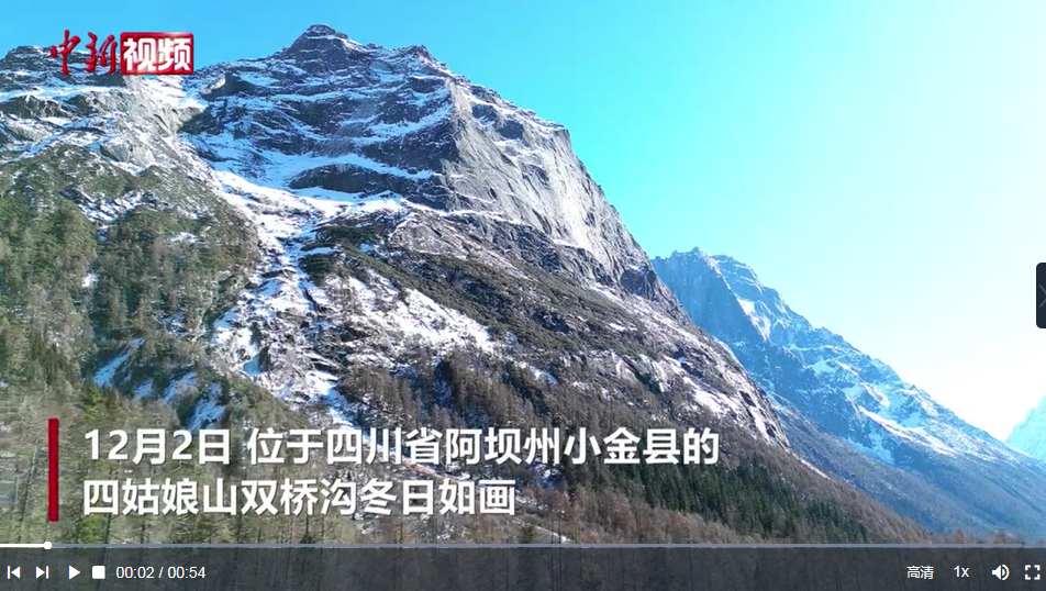 12月2日,位于四川省阿壩州小金縣的四姑娘山雙橋溝冬日如畫。隨著冬季到來,四姑娘山雙橋溝多座山峰被皚皚白雪覆蓋,紅葉、雪山倒映在清澈的湖面形成一幅美麗畫卷,冰雪旅游逐漸火熱。(記者 張浪 制作 劉鵬)