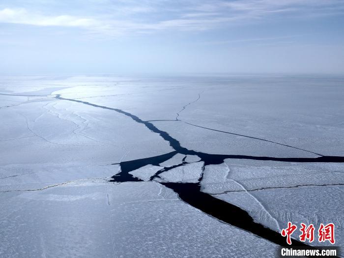 航拍圖為封凍的青海湖冰面開裂。(無人機照片)中新社記者 李雋 攝