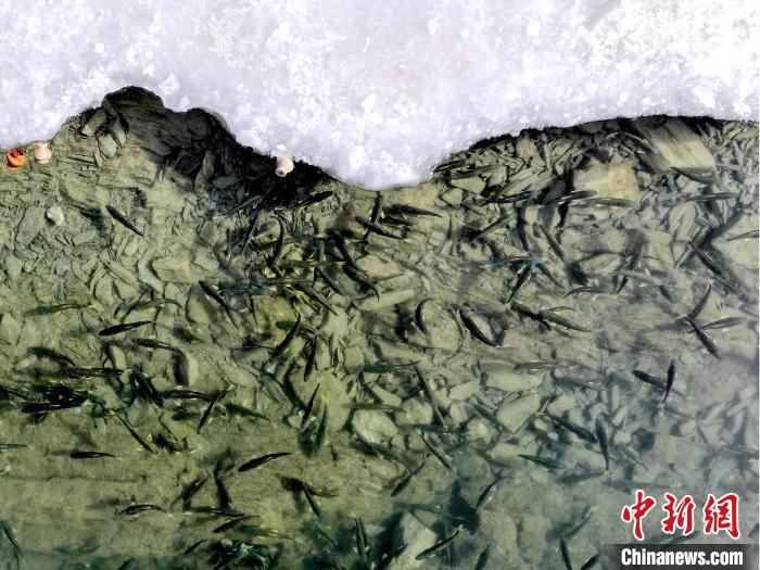 航拍圖為青海湖冰層開裂處的青海湖裸鯉。(無人機照片)中新社記者 李雋 攝