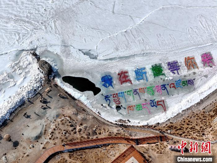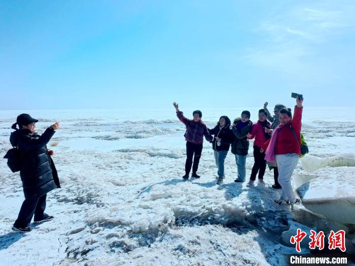 圖為游客在湖冰堆積處留影。中新社記者 李雋 攝