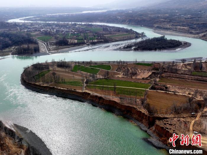 航拍圖為蜿蜒流淌的黃河上游尖扎段。(無人機照片)薛蒂 攝