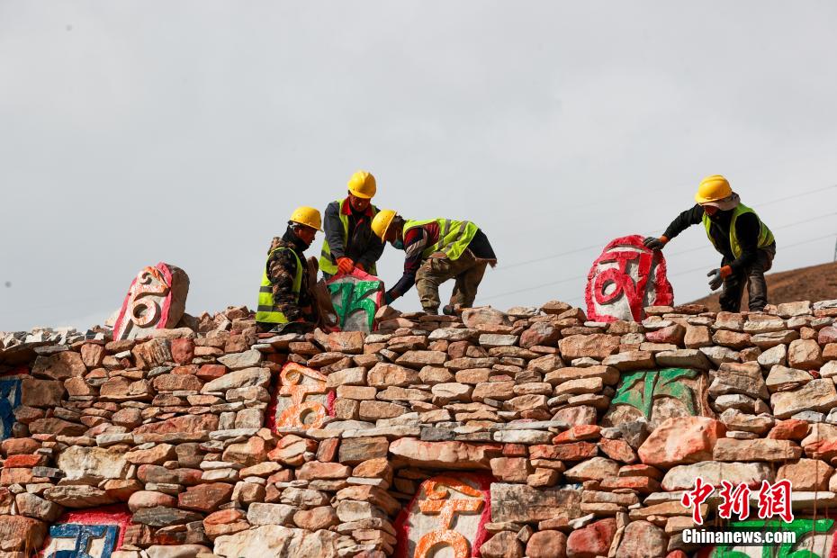 4月12日,在青海省玉樹藏族自治州玉樹市,工作人員整理瑪尼石堆上的石塊。據(jù)了解,玉樹嘉那瑪尼石的形成和發(fā)展已有300多年的歷史,嘉那瑪尼石經(jīng)城內(nèi)石刻數(shù)量多達(dá)25億塊,2002年被載入吉尼斯世界紀(jì)錄,成為世界最大的瑪尼堆。中新社記者 薛蒂 攝