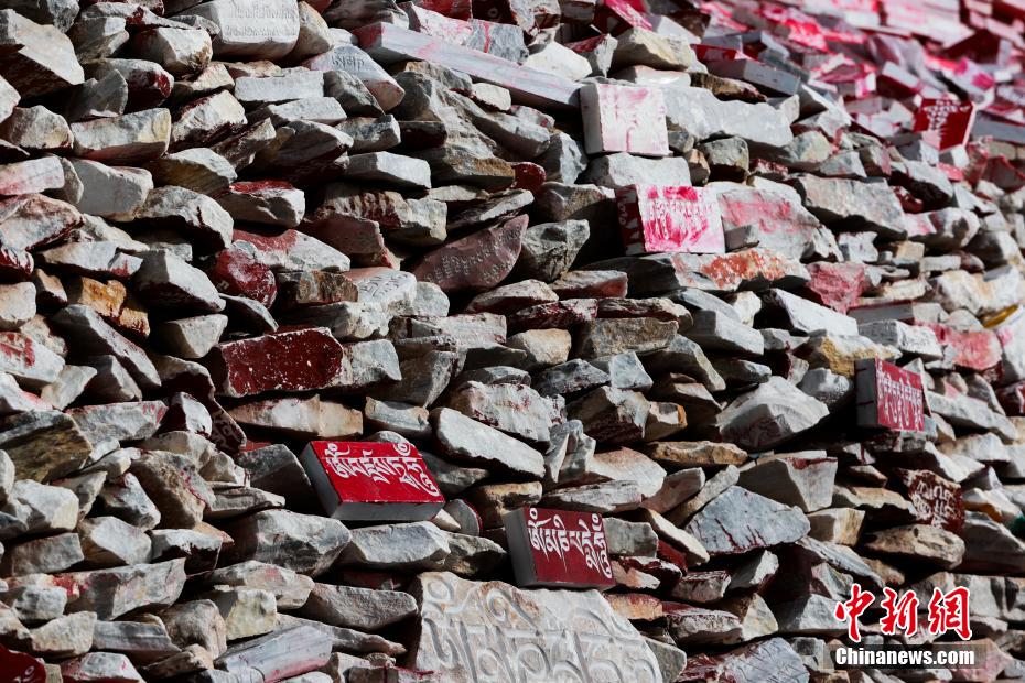 4月12日,在青海省玉樹藏族自治州玉樹市,瑪尼石堆一景。據(jù)了解,玉樹嘉那瑪尼石的形成和發(fā)展已有300多年的歷史,嘉那瑪尼石經(jīng)城內(nèi)石刻數(shù)量多達(dá)25億塊,2002年被載入吉尼斯世界紀(jì)錄,成為世界最大的瑪尼堆。中新社記者 薛蒂 攝