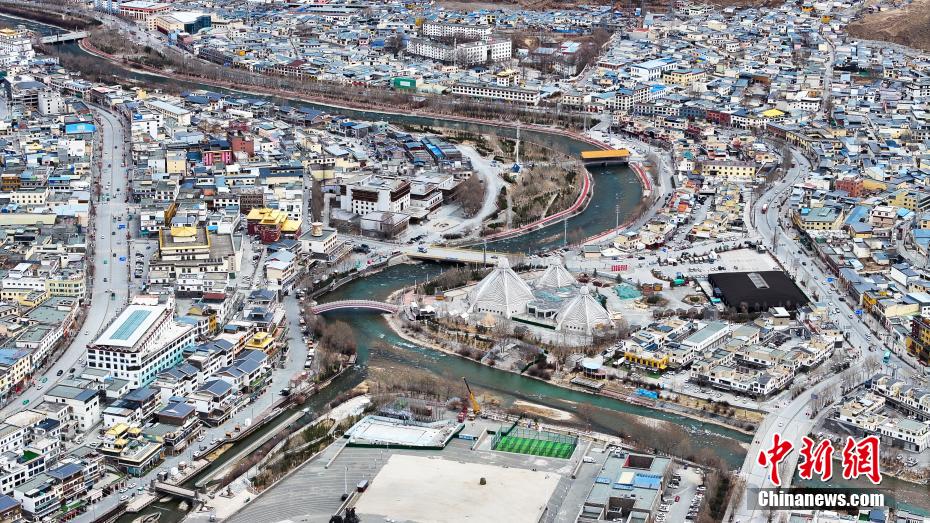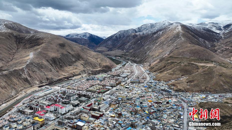 4月14日,航拍青海省玉樹藏族自治州玉樹市建筑群。玉樹市地處三江之源,市區(qū)依山而建,扎曲河穿城而過,傳統(tǒng)藏式風(fēng)格建筑與現(xiàn)代化設(shè)施巧妙結(jié)合。(無人機(jī)照片)中新社記者 薛蒂 攝