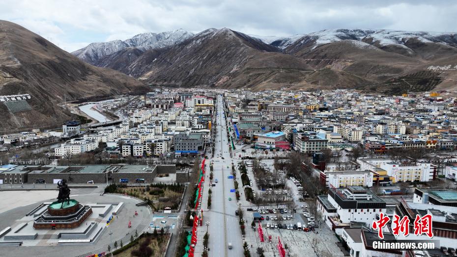 4月14日,航拍青海省玉樹藏族自治州玉樹市格薩爾王廣場。玉樹市地處三江之源,市區(qū)依山而建,扎曲河穿城而過,傳統(tǒng)藏式風(fēng)格建筑與現(xiàn)代化設(shè)施巧妙結(jié)合。(無人機(jī)照片)中新社記者 薛蒂 攝