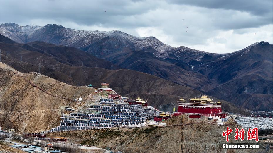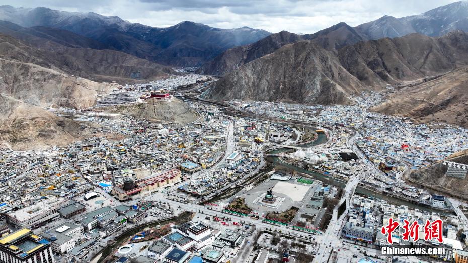 4月14日,航拍青海省玉樹藏族自治州玉樹市結(jié)古寺。玉樹市地處三江之源,市區(qū)依山而建,扎曲河穿城而過,傳統(tǒng)藏式風(fēng)格建筑與現(xiàn)代化設(shè)施巧妙結(jié)合。(無人機(jī)照片)中新社記者 薛蒂 攝