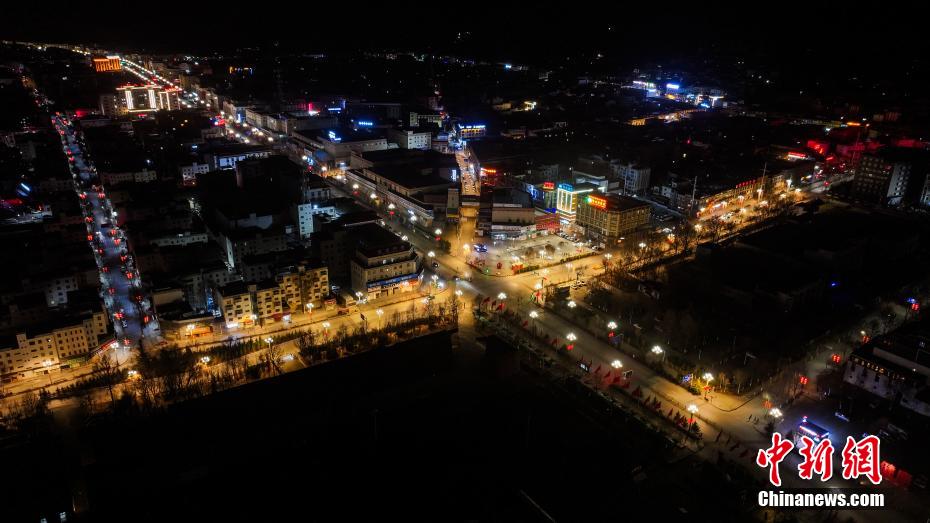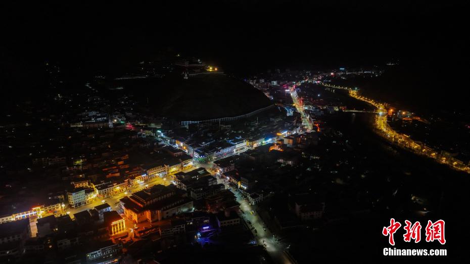 4月14日,航拍青海省玉樹藏族自治州玉樹市夜景。玉樹市地處三江之源,市區(qū)依山而建,扎曲河穿城而過,傳統(tǒng)藏式風(fēng)格建筑與現(xiàn)代化設(shè)施巧妙結(jié)合。(無人機(jī)照片)中新社記者 薛蒂 攝