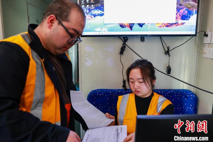 4月27日,中國鐵路青藏集團有限公司西寧工務機械段養(yǎng)路機械駕駛員俞慶(右一)與同事交接文件。中新社記者 薛蒂 攝
