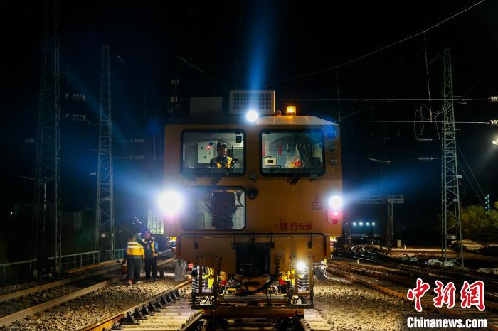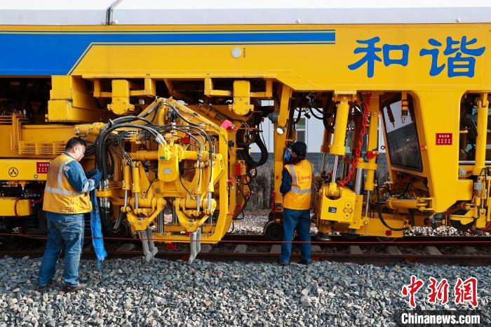 4月27日,中國鐵路青藏集團有限公司西寧工務機械段養(yǎng)路機械駕駛員俞慶(右一)和同事一起保養(yǎng)設(shè)備。中新社記者 薛蒂 攝