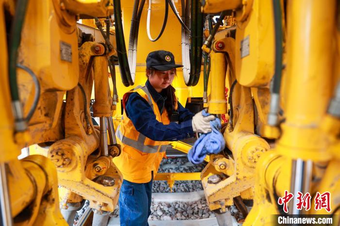 4月27日,中國鐵路青藏集團有限公司西寧工務機械段養(yǎng)路機械駕駛員俞慶擦拭搗固車工作裝置。中新社記者 薛蒂 攝