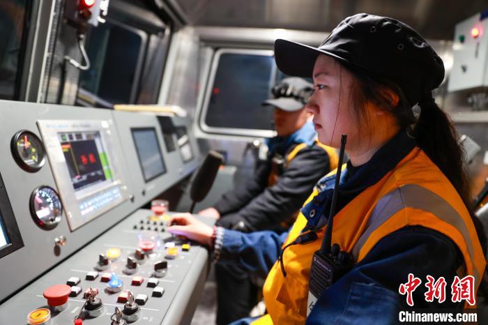 4月27日,中國鐵路青藏集團有限公司西寧工務機械段養(yǎng)路機械駕駛員俞慶(駕駛室內(nèi))觀察施工車輛前方線路。中新社記者 薛蒂 攝
