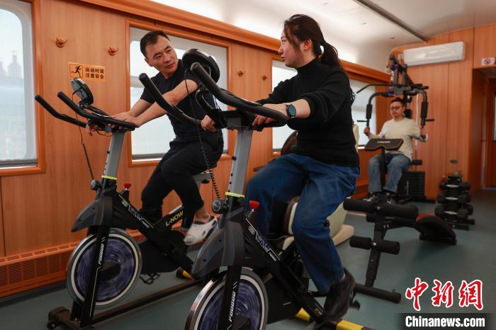4月27日,中國鐵路青藏集團有限公司西寧工務機械段養(yǎng)路機械駕駛員余慶(右一)和同事在宿營車內(nèi)健身。中新社記者 薛蒂 攝