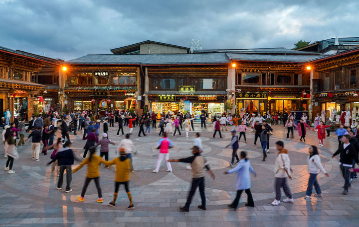 游客和當(dāng)?shù)厝罕娫谠颇鲜〉蠎c州香格里拉市獨(dú)克宗古城里一起跳舞(2024年9月27日攝)。新華社記者 王靜頤 攝