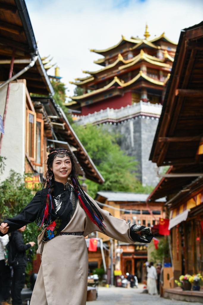 2024年9月27日,游客在獨(dú)克宗古城里體驗(yàn)旅拍。新華社記者 王靜頤 攝