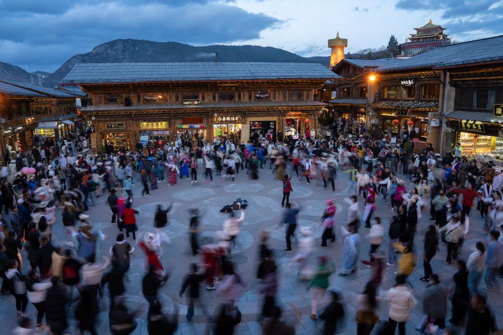 2024年5月3日,在云南迪慶藏族自治州香格里拉市,游客與當(dāng)?shù)厝罕娫讵?dú)克宗古城四方街廣場跳鍋莊。新華社 馬宏波 攝
