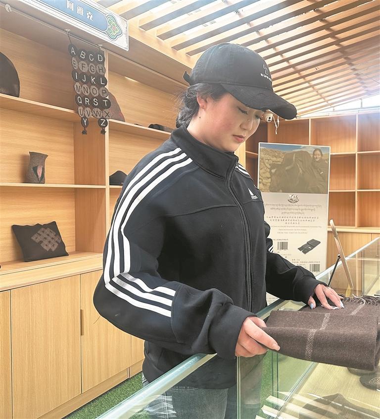在村寨核心地段的“藏城之窗”體驗區(qū),剛剛大學(xué)畢業(yè)的村民多杰吉正在擺放綠松石、瑪瑙等具有民族特色的飾品?!斑@里是我們村集體經(jīng)濟(jì)的一部分,2024年7月開業(yè),現(xiàn)在為9家公司和20多個手工作坊代售商品。除了牦牛肉干、沙棘果汁等農(nóng)特產(chǎn)品,這種牛絨制成的圍巾和帽子也很受歡迎?!倍嘟芗獰崆榈厝∠乱粭l牛絨圍巾,未經(jīng)過染色處理的棕黑色圍巾摸上去質(zhì)地十分柔軟。