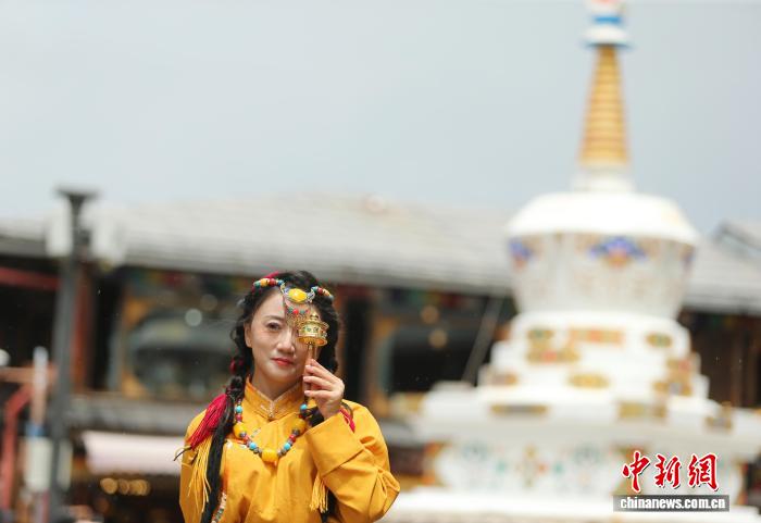 8月15日,一名游客身著藏裝打卡獨(dú)克宗古城。中新社記者 黃興鴻 攝