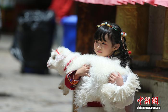 8月15日,一名女童在獨(dú)克宗古城與小綿羊合影。中新社記者 黃興鴻 攝