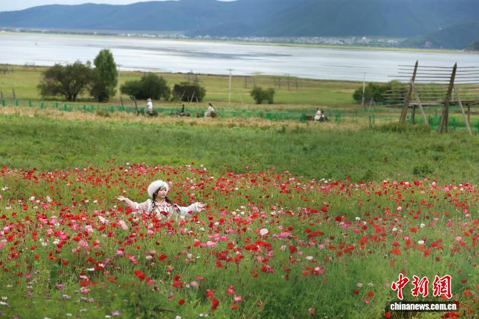 8月15日,一名游客身著藏裝打卡納帕海。中新社記者 黃興鴻 攝