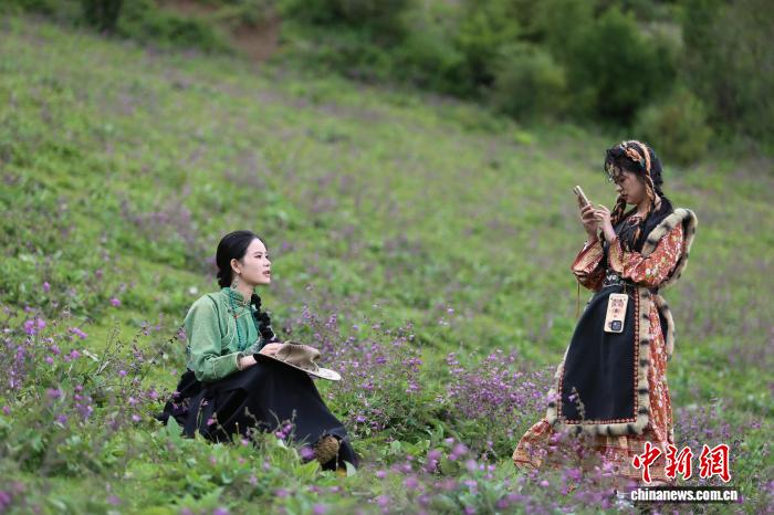 8月15日,兩名游客身著藏裝在納帕海欣賞花田。中新社記者 黃興鴻 攝