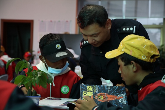 亞?wèn)|出入境邊防檢查站圖書(shū)室對(duì)駐地中學(xué)學(xué)生開(kāi)放,民警為學(xué)生講解書(shū)本知識(shí)。張雨強(qiáng) 攝