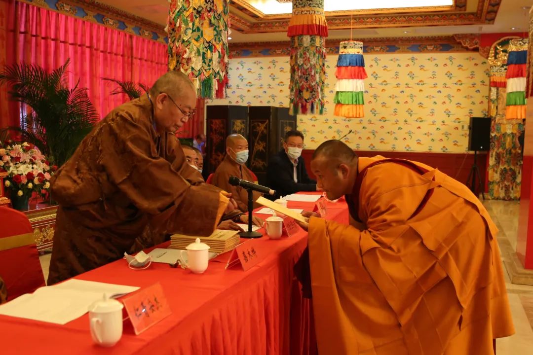 中國佛教協(xié)會副會長、藏傳佛教學銜工作指導委員會主任、中國藏語系高級佛學院院長嘉木樣活佛向“拓然巴”高級學銜獲得者頒發(fā)學銜證書。中國佛教協(xié)會副會長、藏傳佛教學銜工作指導委員會副主任珠康·土登克珠活佛向“拓然巴”高級學銜獲得者表示祝賀。