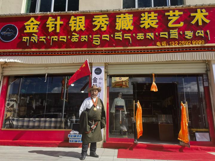 布嘎在他的“金針銀秀藏裝藝術”縫紉店前。新華社記者 舒靜 攝
