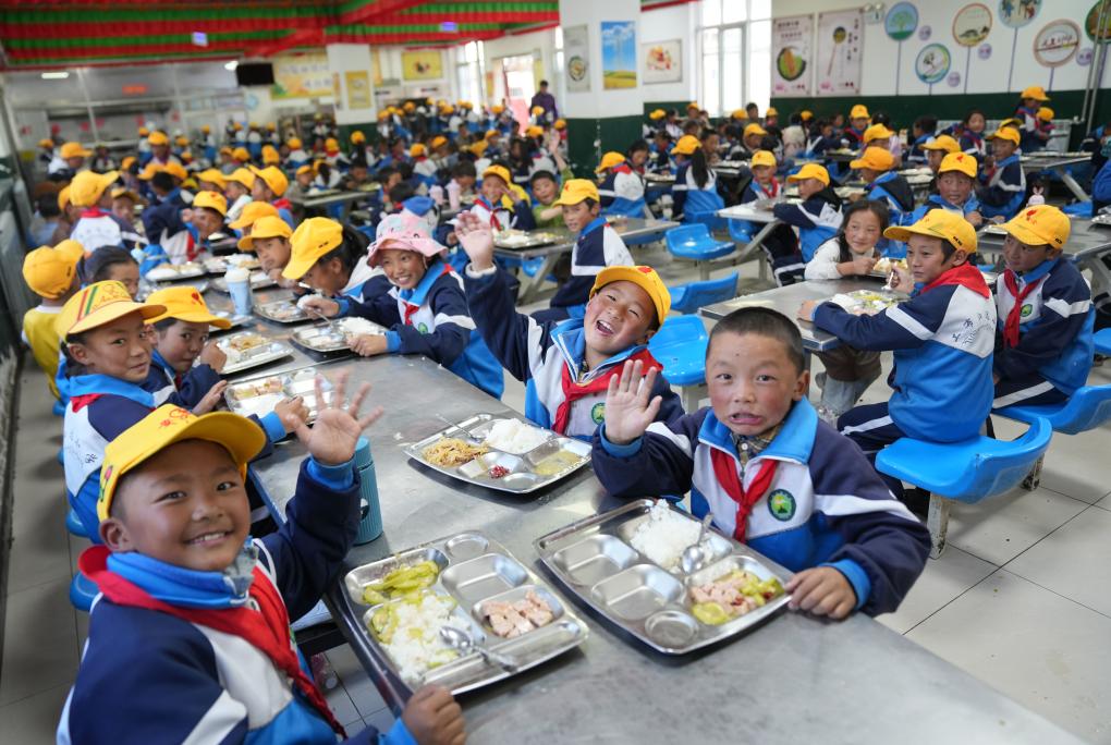 娘蒲鄉(xiāng)中心小學的學生們在享用午餐(9月3日攝)。新華社記者 晉美多吉 攝