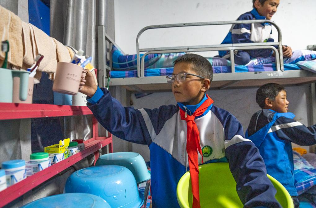 今年10歲的貢喬熱旦上五年級,他在班里的成績一直名列前茅。性格開朗、喜歡運動的他,時不時和班里的同學開個小玩笑。這所學校的大部分學生選擇寄宿制學習,學校實行“10+4”工作日教學模式,即上課10天、休息4天,這樣方便父母接送孩子,也有利于孩子們從小培養(yǎng)自理生活能力。