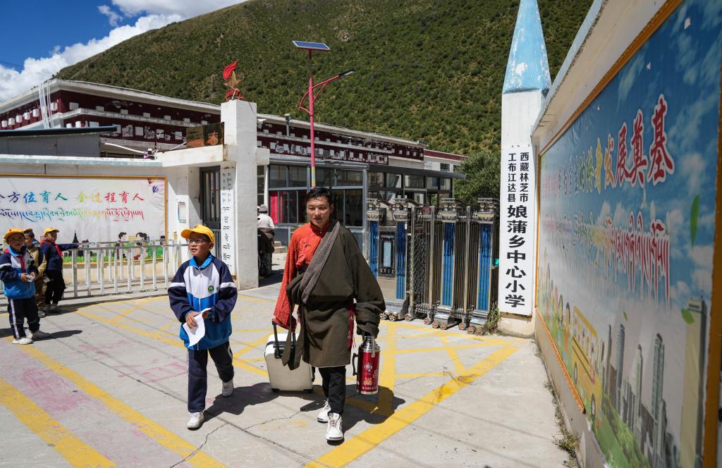 娘蒲鄉(xiāng)中心小學門口,王登領(lǐng)著兒子貢喬熱旦(左)準備回家(9月4日攝)。新華社記者 晉美多吉 攝