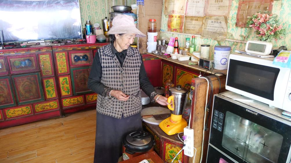 對瓊國來說,生活中變化極大的就是生產(chǎn)酥油?!坝秒妱铀钟蜋C(jī),一桶奶幾分鐘就能打完,太省事了!”瓊國家的冰箱里如今常備著二十幾斤酥油。電動酥油機(jī)“上崗”后,酥油桶就閑置了。