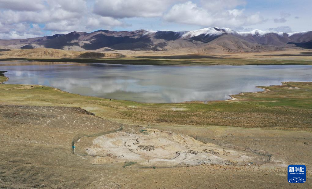 這是5月22日拍攝的坐落在瑪不錯湖畔的遺址第四期石構(gòu)地面建筑考古發(fā)掘現(xiàn)場(無人機照片)。新華社記者 李賀 攝