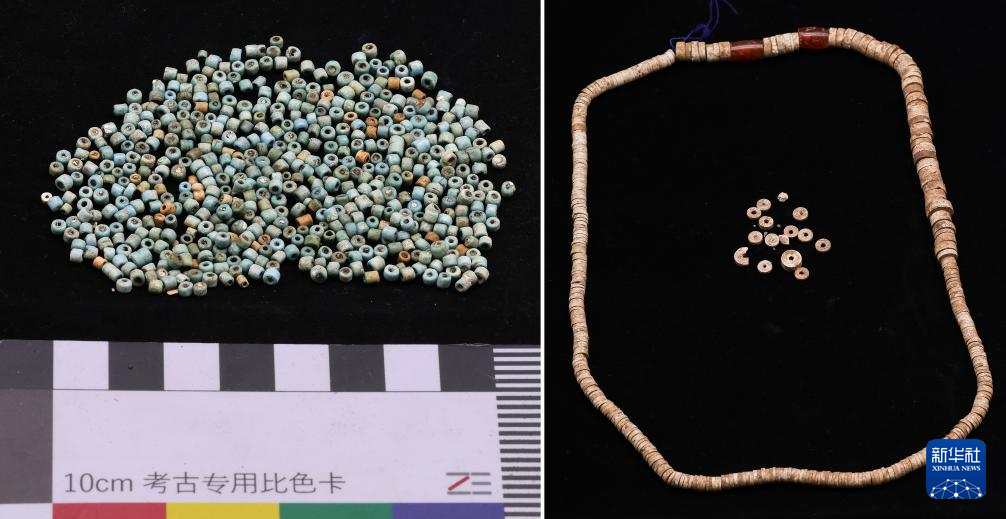 這是瑪不錯遺址出土的費昂斯珠(左)和帶有紅玉髓的滑石珠串(拼版照片)。新華社發(fā)(西藏自治區(qū)文物保護研究所供圖)