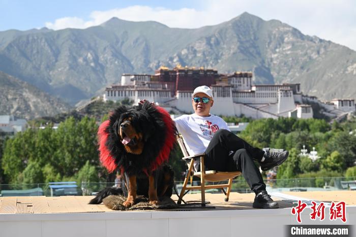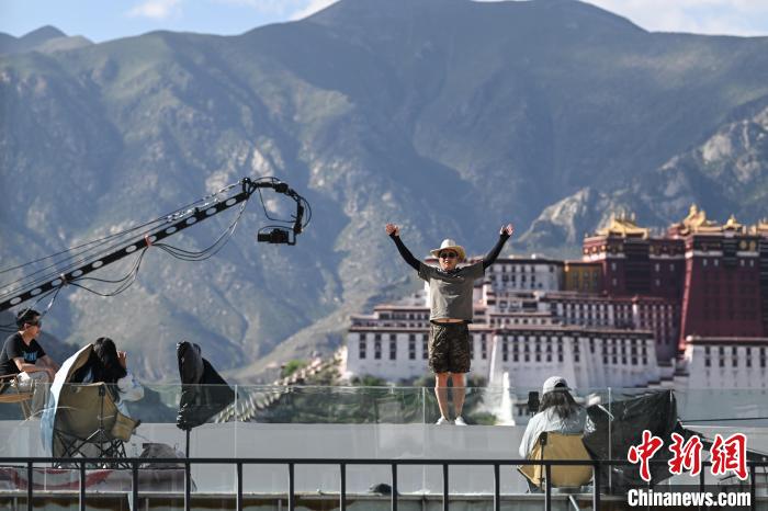 7月7日,游客在西藏拉薩市的一家景觀咖啡廳拍攝以布達(dá)拉宮為背景的 “旱地拔蔥” 。中新社記者 貢嘎來(lái)松 攝