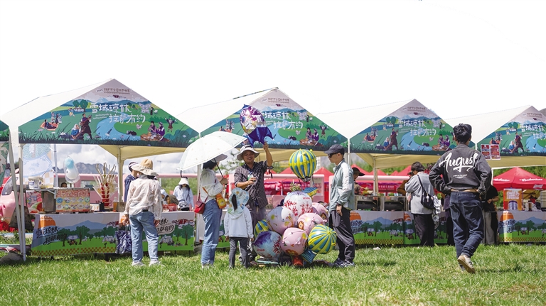 記者看到,綠野市集“沖賽康”充滿了煙火氣,30余家特色攤位齊聚林間。這里不僅有藏式甜茶、糌粑制品等傳統(tǒng)美食,讓游客大飽口福,還有氆氌文創(chuàng)、非遺手作等特色產(chǎn)品,滿足游客的購物需求。此外,互動游戲與民俗體驗也吸引了眾多游客參與,營造出充滿活力的林卡生活場景。