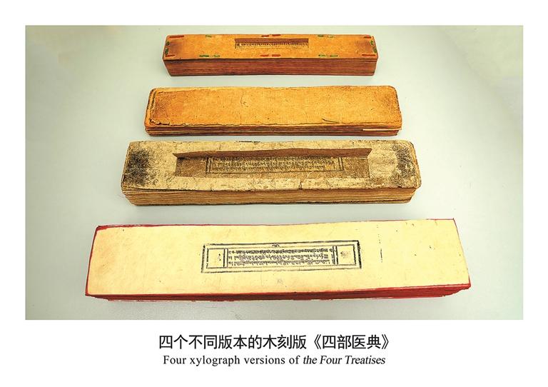 四個不同版本的木刻版《四部醫(yī)典》。自治區(qū)藏醫(yī)院文獻(xiàn)研究所提供
