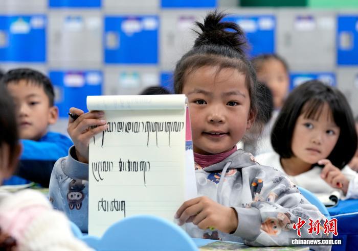 9月1日,拉薩市第一小學(xué)一年級(jí)二班的學(xué)生展示在藏語文課上書寫的藏文。近日,西藏拉薩市秋季學(xué)期開學(xué),各項(xiàng)教學(xué)工作有序開展。中新社記者 李林 攝