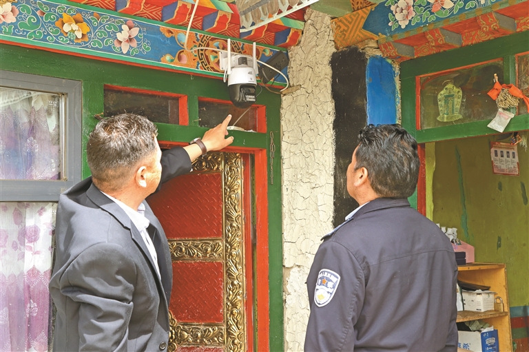 多卻鄉(xiāng)負(fù)責(zé)人與浪卡子縣公安局民警入戶了解家裝自衛(wèi)探頭運行情況。