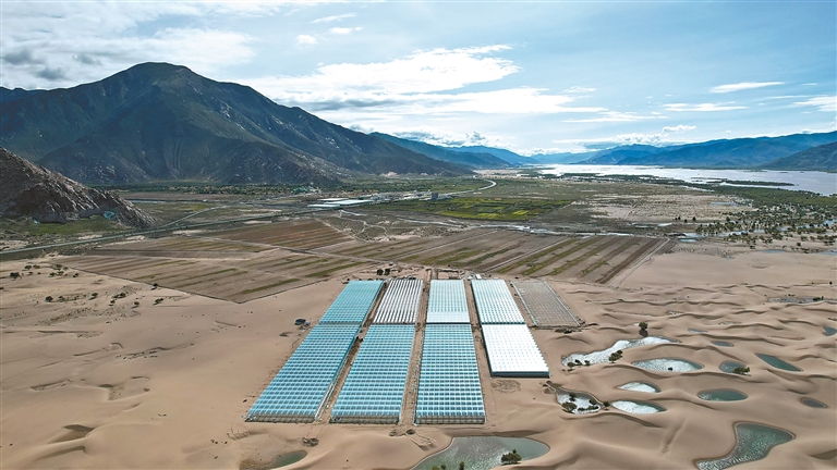 位于扎囊縣的國家農(nóng)業(yè)產(chǎn)業(yè)化示范企業(yè)——西藏綠之源現(xiàn)代農(nóng)業(yè)科技股份有限公司二期項目,如同一片“綠洲”鑲嵌在沙丘之中。記者 丹增平措 攝