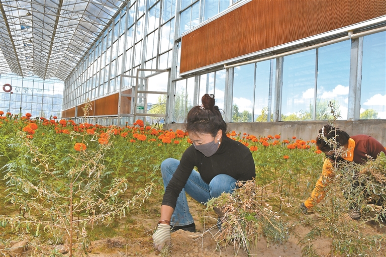圖為在家門口實現(xiàn)就業(yè)的群眾在產(chǎn)業(yè)基地進行田間管理。記者 丹增平措 攝
