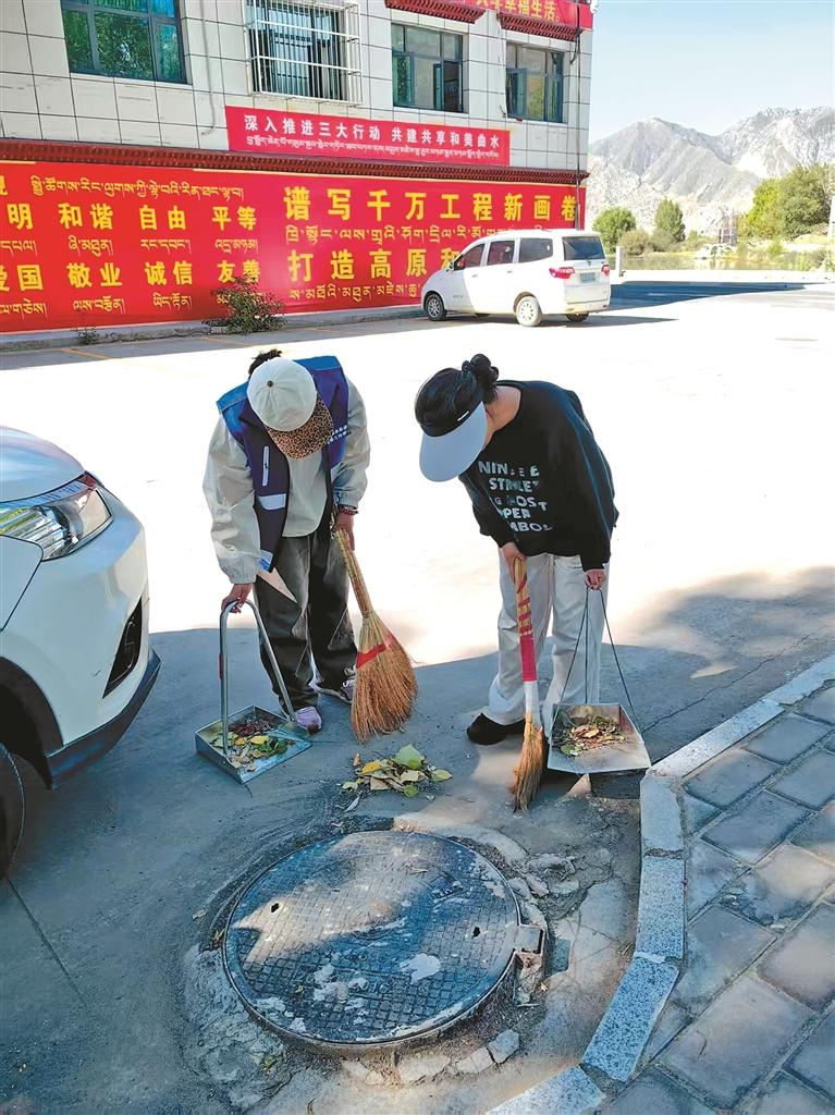 “鄰里守望·阿佳行動”志愿者在打掃轄區(qū)衛(wèi)生。