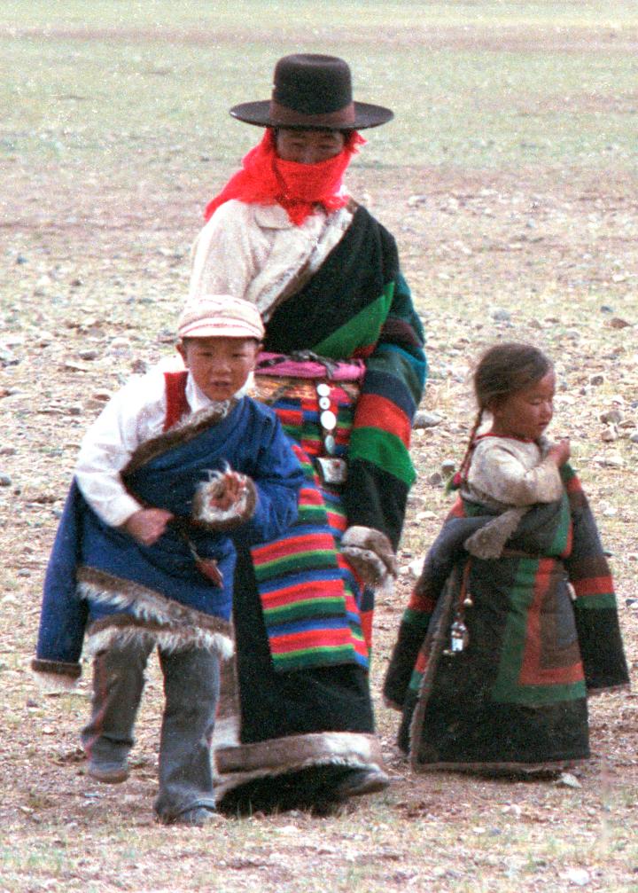 1987年,在西藏那曲地區(qū)文部辦事處(現那曲市尼瑪縣)賽馬會上,小男孩次仁石達(左一)和她阿媽達曲(中)在一起。新華社記者 唐召明 攝