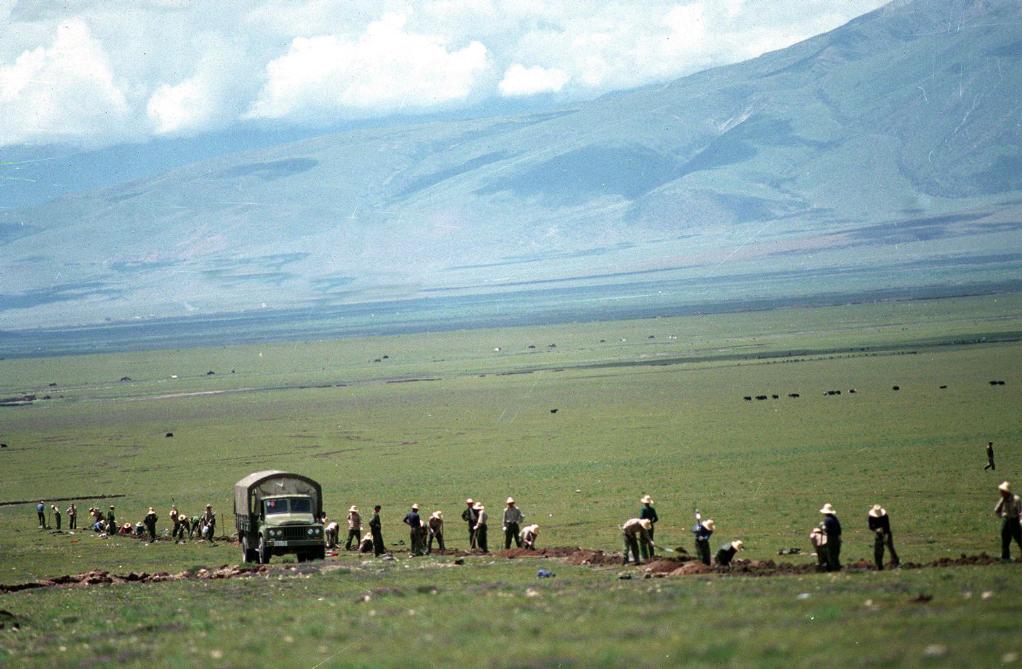 蘭州——西寧——拉薩光纜工程,從1997年7月開始施工。這是工人和駐藏部隊官兵在海拔4000多米的藏北草原上準備鋪設光纜的情景。(1997年9月18日發(fā))