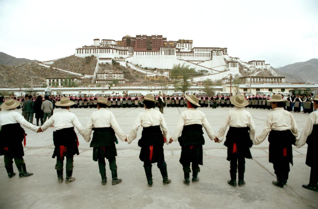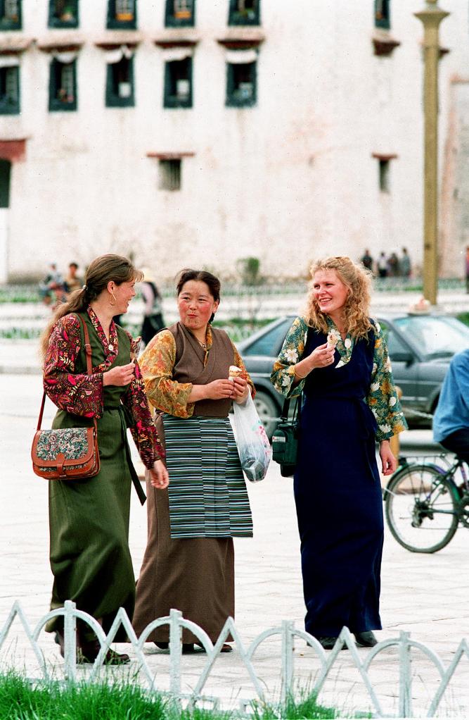 在拉薩市布達拉宮前,兩位身著藏裝的外國游客和一位藏族婦女交談。交通和旅游服務設施的逐步完善,為獨具風情的西藏高原引來了更多的游客。(1997年11月13日發(fā))