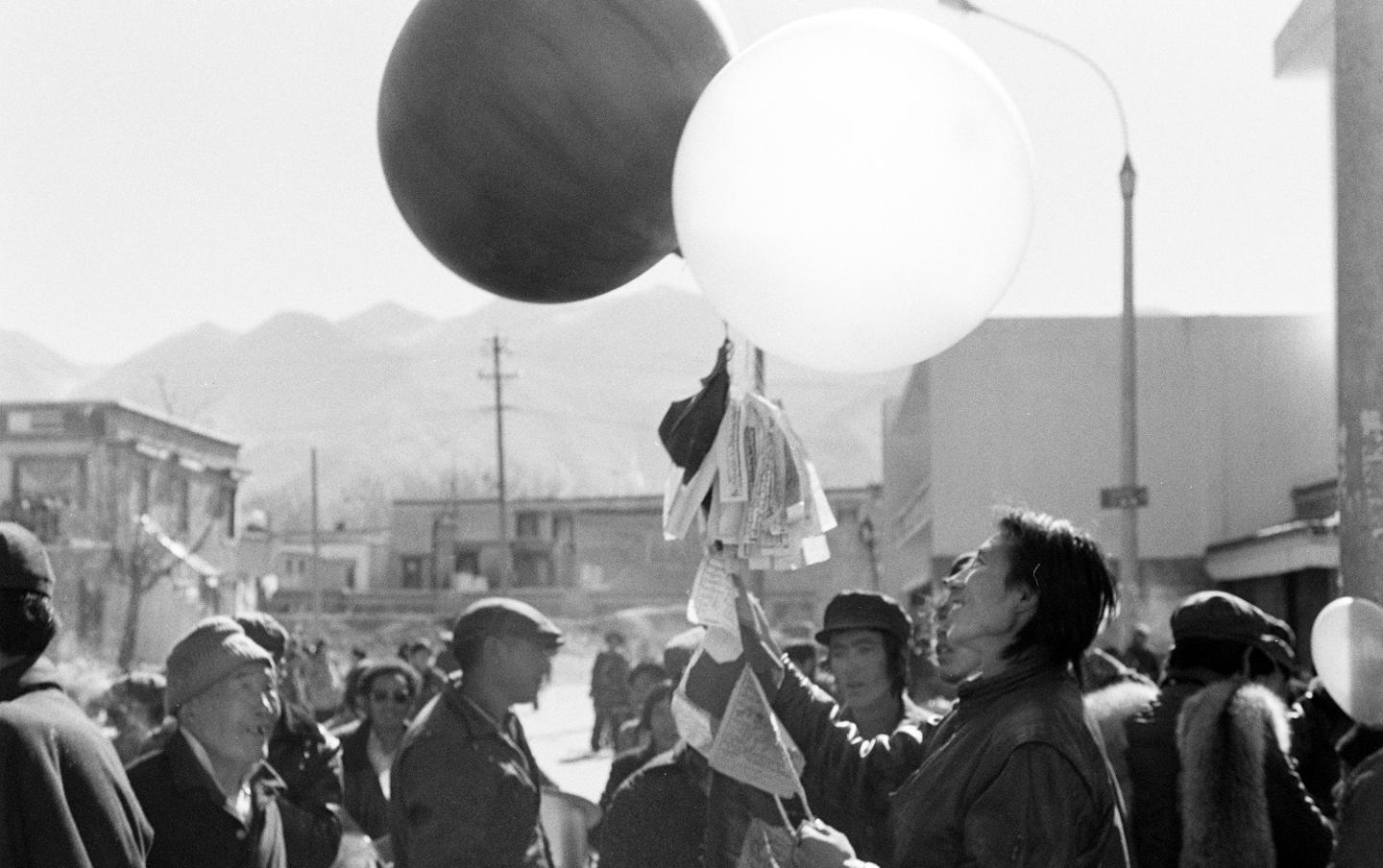 1989年新年伊始,拉薩市街頭出現了賣大氣球的個體戶,藏族市民喜歡將經幡掛在彩色氣球下,放飛空中。