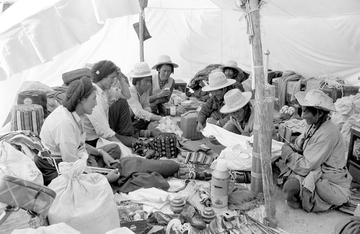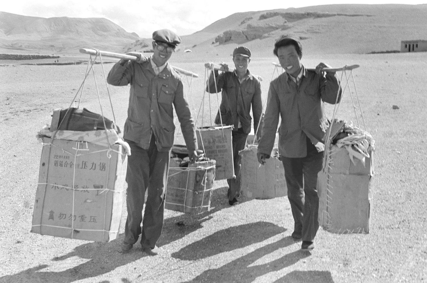 隨著“無人區(qū)”的開發(fā)建設,在這亙古荒原迎來了內地貨郎擔。這是來自甘肅省秦安縣興豐鄉(xiāng)的三位農民肩挑商品來到海拔5000米的文部草原出售商品(1987年9月16日發(fā))。