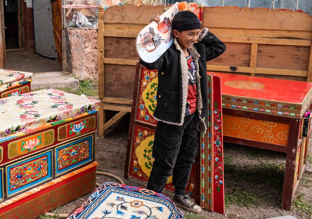 雙湖縣多瑪鄉(xiāng)仲魯瑪村的一個小朋友拿著自己心愛的滑板,準備搬去新家(2022年7月13日攝)。新華社記者 孫非 攝